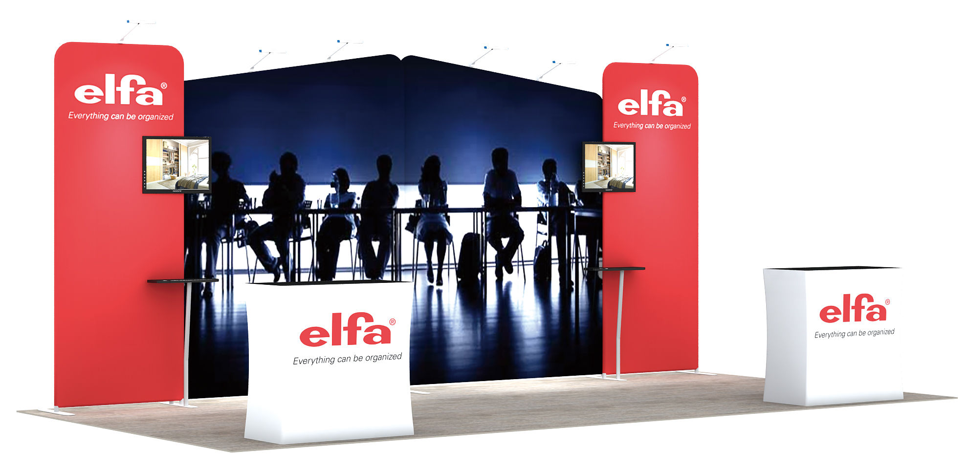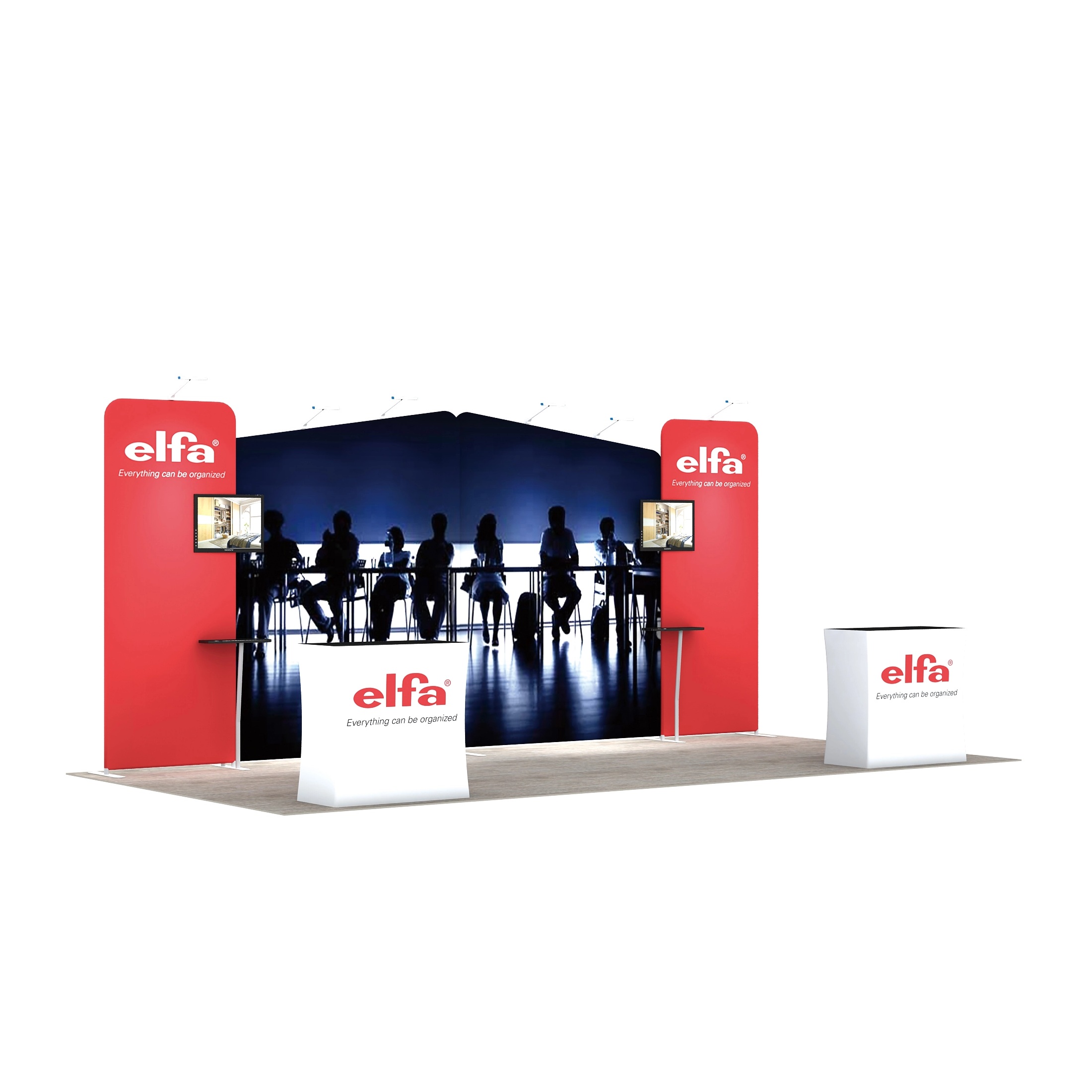 20Ft Standard Booth solution is a versatile combination of the standard ABCD backwalls to form unique designs for 20Ft booth space.