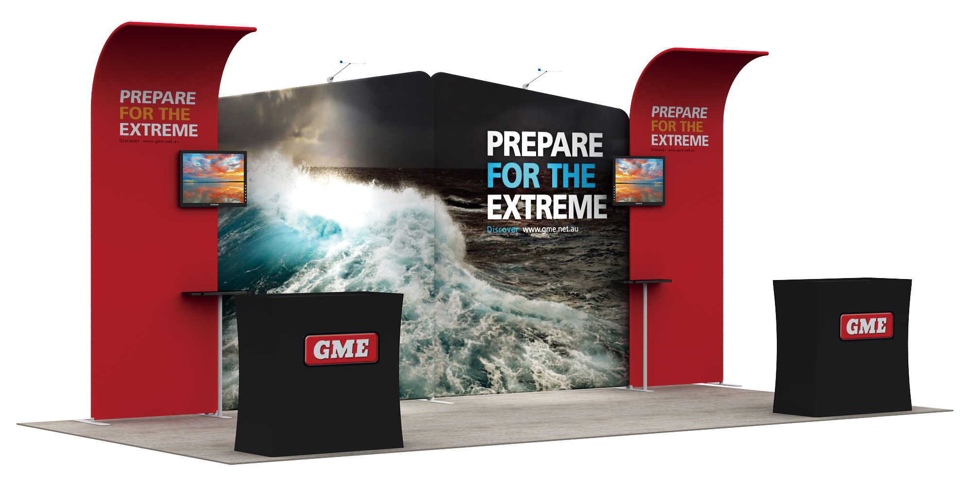 20Ft Standard Booth solution is a versatile combination of the standard ABCD backwalls to form unique designs for 20Ft booth space.