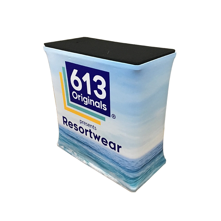 A: It uses a dye-sublimated stretch fabric wrap that covers the front, sides, and top. This custom graphic provides full branding potential and is easy to change if you update your design.